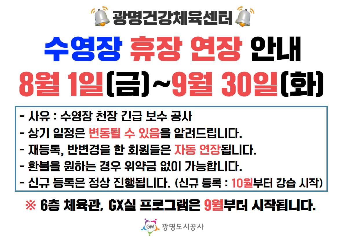 광명건강체육센터 수영장 휴장 연장 안내(~9/30)