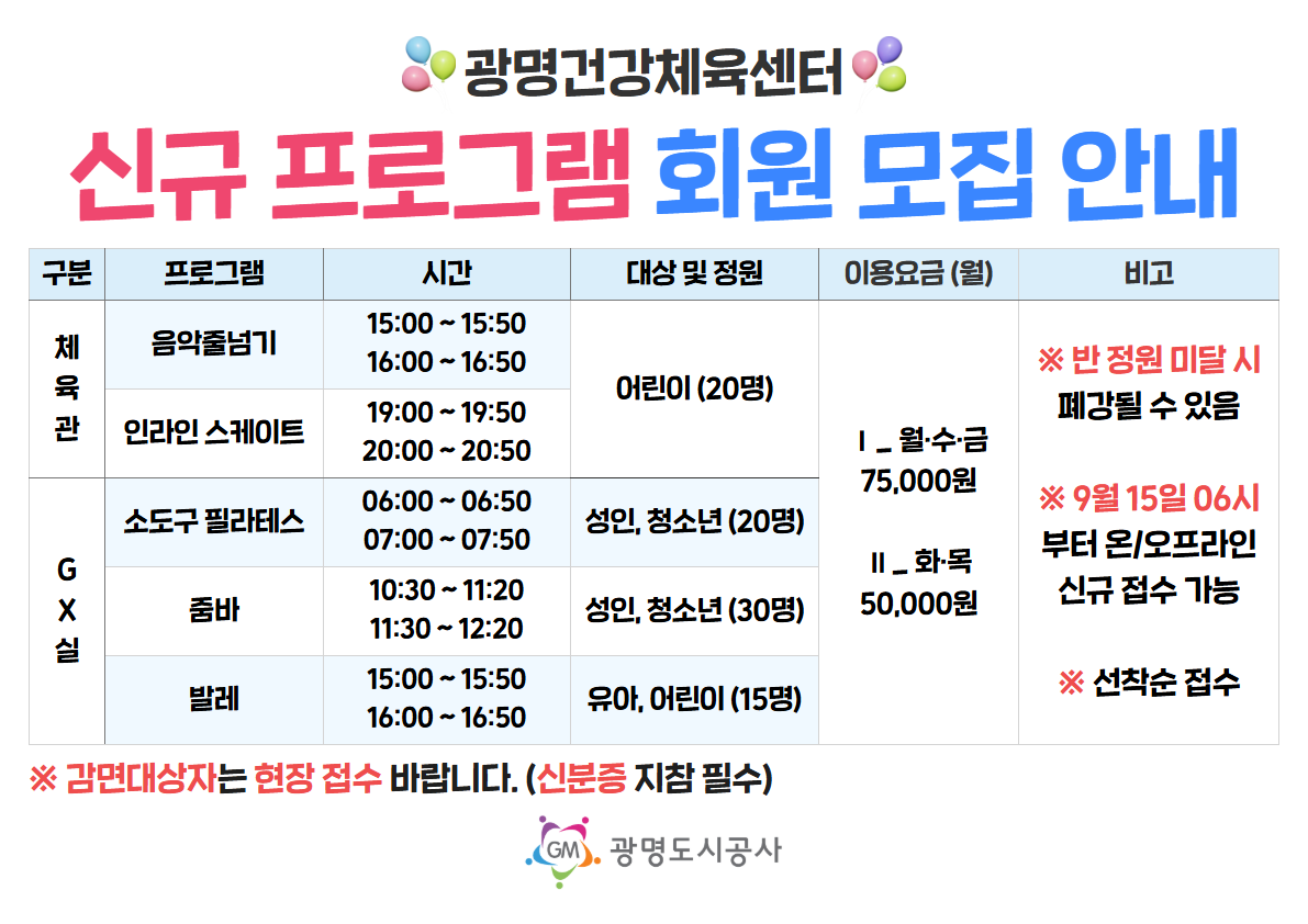광명건강체육센터 신규 프로그램 회원 모집 안내